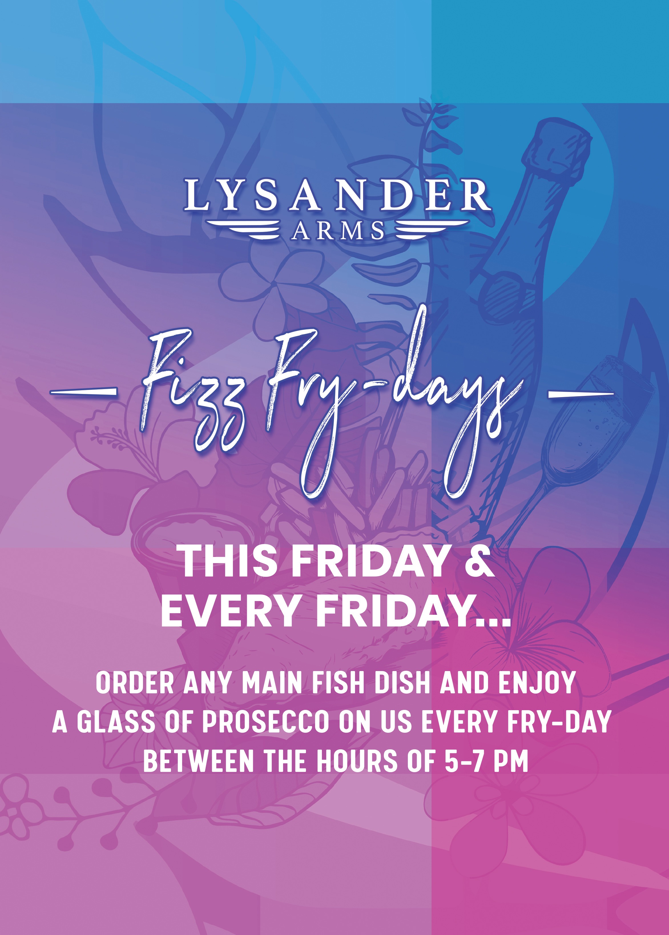 Order any main fish dish and enjoy a glass of Prosecco on us every Fry-day between the hours of 5-7 pm.
