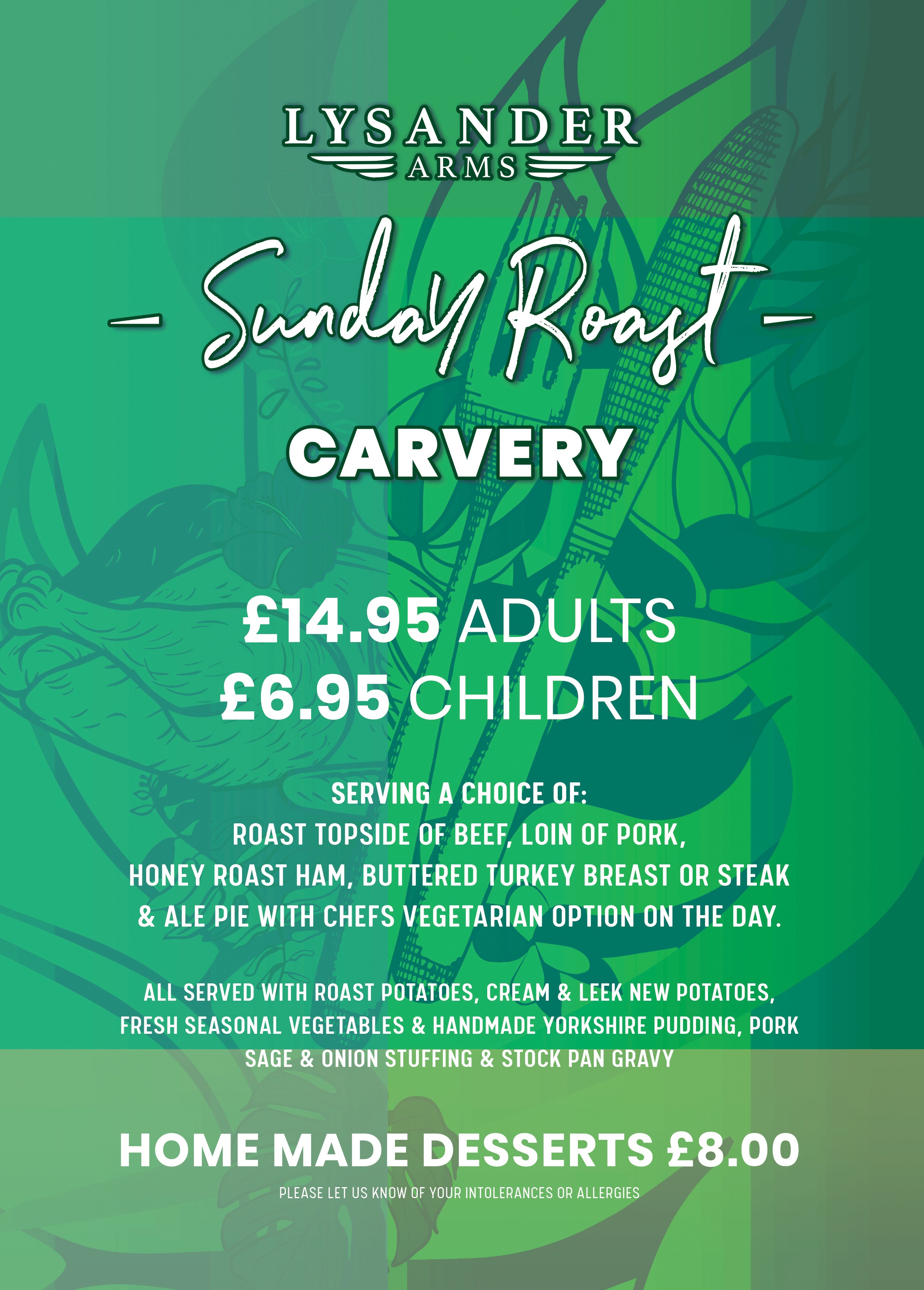 Roast topside of beef, loin of pork, honey roast ham, buttered turkey breast or steak & ale pie with chefs vegetarian option on the day.